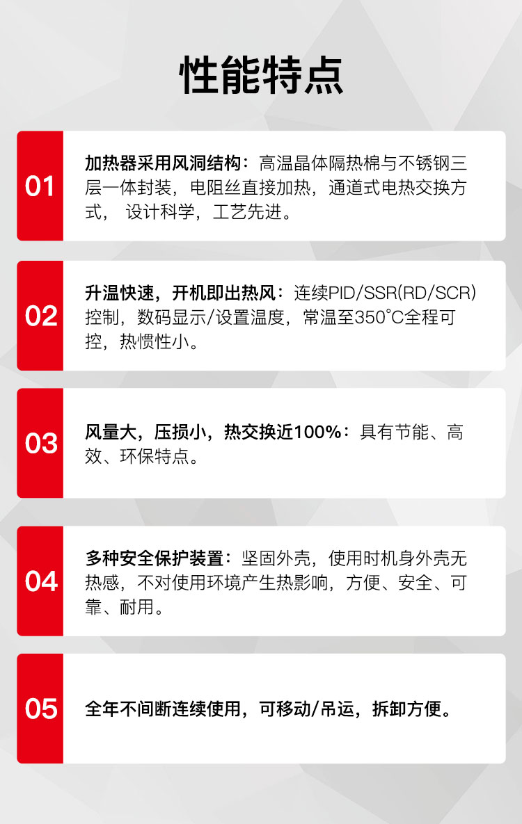 ③熱風在出口溫度為200°C時,發熱絲表面溫度僅350°C而已,這種熱交換率讓本產品達到其它加熱器無法達到的要求。