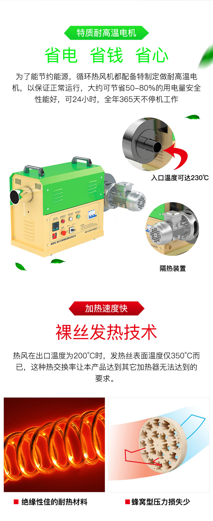④為了節約能源,循環型系列熱風機都配備特制定做耐高溫電機,以保證正常運行,大約可節省50-80%的用電量。