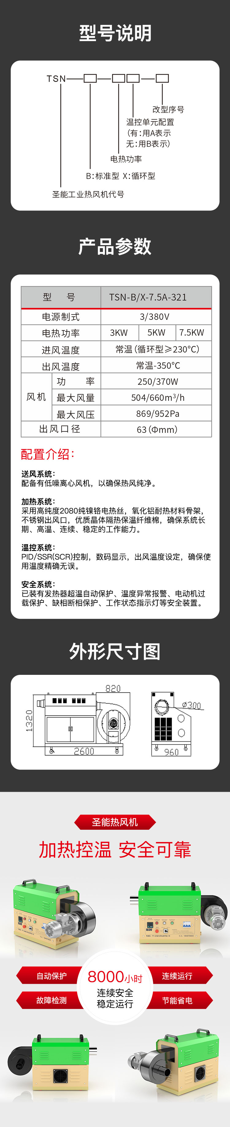 “TSN”工業熱風機主要由送風系統、加熱系統、溫控系統三大部分部分組成。通電后,鼓風機把空氣吹送到加熱器里,令空氣從螺旋狀的電熱絲內、外側均勻通過,電熱絲通電后產生的熱量與通過的冷空氣進行熱交換,從而使出風口的風溫升高。出風口處的K型熱電偶及時將探測到的出風溫度反饋到溫控儀,儀表根據設定的溫度檢測著工作的實際溫度,并將有關信息傳遞回固態繼電器進而控制加熱器是否工作。同時,鼓風機可利用風量調節器(變頻器、手動)調節吹送空氣的風量大小。另外,送風系統及加熱器,均有過載超溫自動保護裝置,總電路也設計了緊急摯,以保證安全,防止錯誤操作。