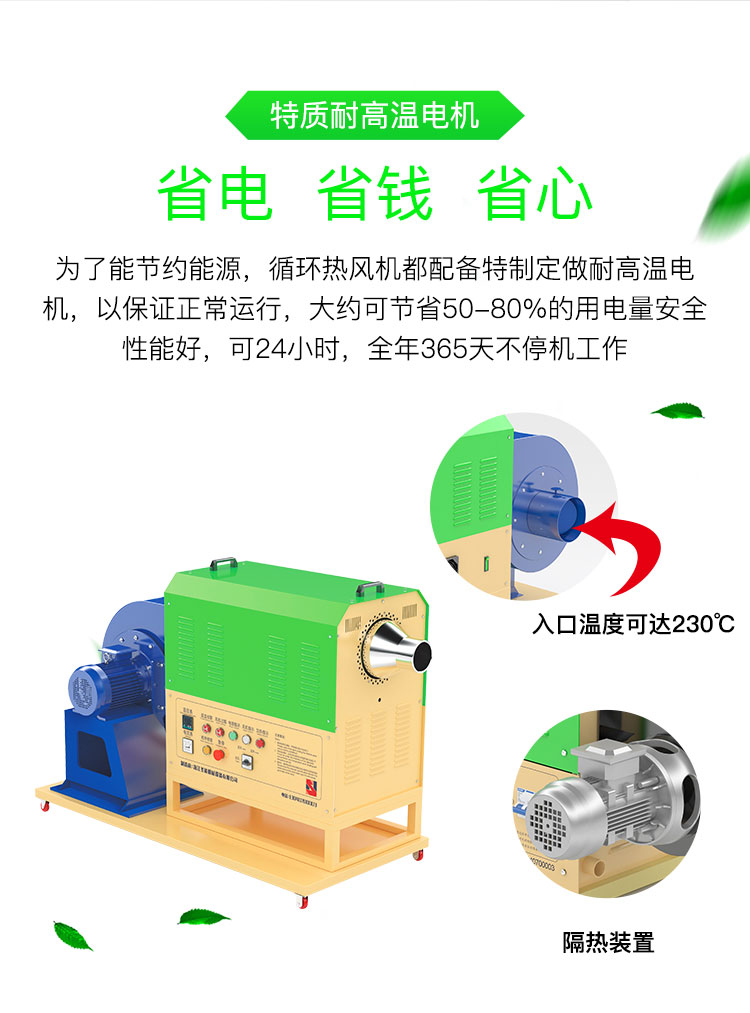 ④為了節(jié)約能源,循環(huán)型系列熱風(fēng)機(jī)都配備特制定做耐高溫電機(jī),以保證正常運(yùn)行,大約可節(jié)省50-80%的用電量。