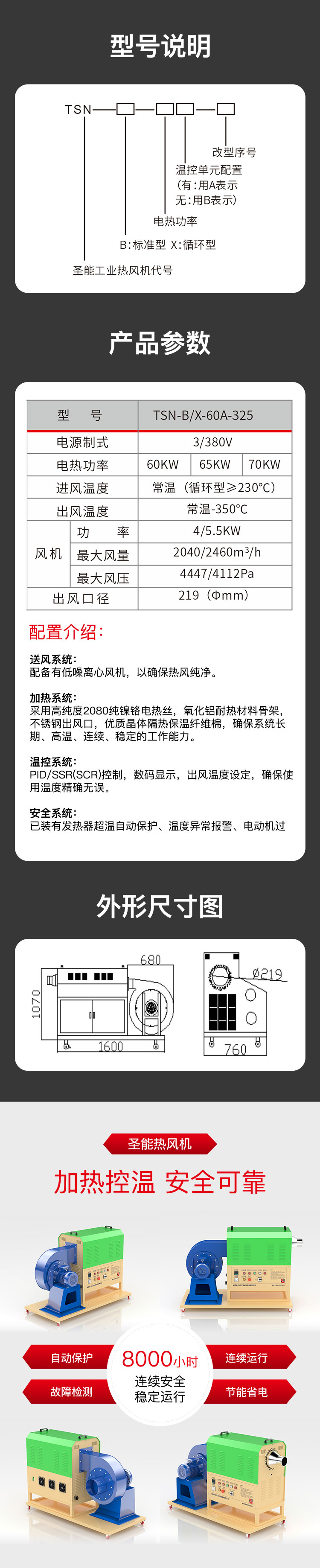 “TSN”工業(yè)熱風(fēng)機(jī)主要由送風(fēng)系統(tǒng)、加熱系統(tǒng)、溫控系統(tǒng)三大部分部分組成。通電后,鼓風(fēng)機(jī)把空氣吹送到加熱器里,令空氣從螺旋狀的電熱絲內(nèi)、外側(cè)均勻通過,電熱絲通電后產(chǎn)生的熱量與通過的冷空氣進(jìn)行熱交換,從而使出風(fēng)口的風(fēng)溫升高。出風(fēng)口處的K型熱電偶及時(shí)將探測(cè)到的出風(fēng)溫度反饋到溫控儀,儀表根據(jù)設(shè)定的溫度檢測(cè)著工作的實(shí)際溫度,并將有關(guān)信息傳遞回固態(tài)繼電器進(jìn)而控制加熱器是否工作。同時(shí),鼓風(fēng)機(jī)可利用風(fēng)量調(diào)節(jié)器(變頻器、手動(dòng))調(diào)節(jié)吹送空氣的風(fēng)量大小。另外,送風(fēng)系統(tǒng)及加熱器,均有過載超溫自動(dòng)保護(hù)裝置,總電路也設(shè)計(jì)了緊急摯,以保證安全,防止錯(cuò)誤操作。