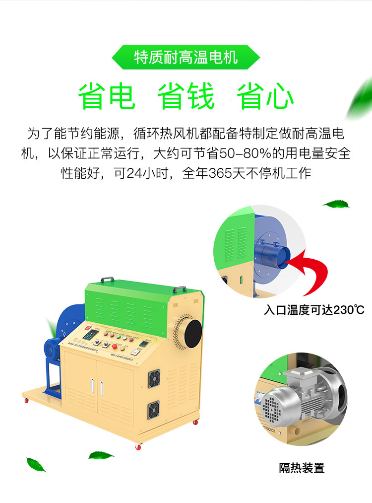 ④為了節約能源,循環型系列熱風機都配備特制定做耐高溫電機,以保證正常運行,大約可節省50-80%的用電量。