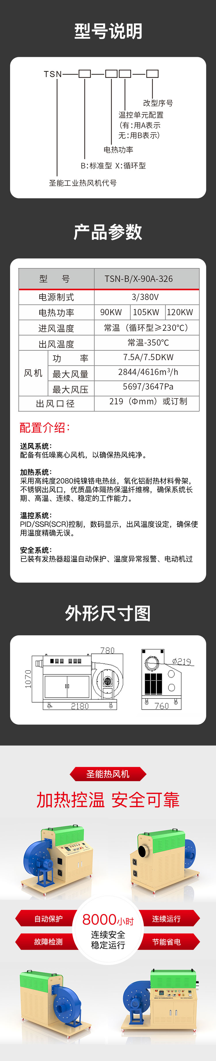 “TSN”工業熱風機主要由送風系統、加熱系統、溫控系統三大部分部分組成。通電后,鼓風機把空氣吹送到加熱器里,令空氣從螺旋狀的電熱絲內、外側均勻通過,電熱絲通電后產生的熱量與通過的冷空氣進行熱交換,從而使出風口的風溫升高。出風口處的K型熱電偶及時將探測到的出風溫度反饋到溫控儀,儀表根據設定的溫度檢測著工作的實際溫度,并將有關信息傳遞回固態繼電器進而控制加熱器是否工作。同時,鼓風機可利用風量調節器(變頻器、手動)調節吹送空氣的風量大小。另外,送風系統及加熱器,均有過載超溫自動保護裝置,總電路也設計了緊急摯,以保證安全,防止錯誤操作。