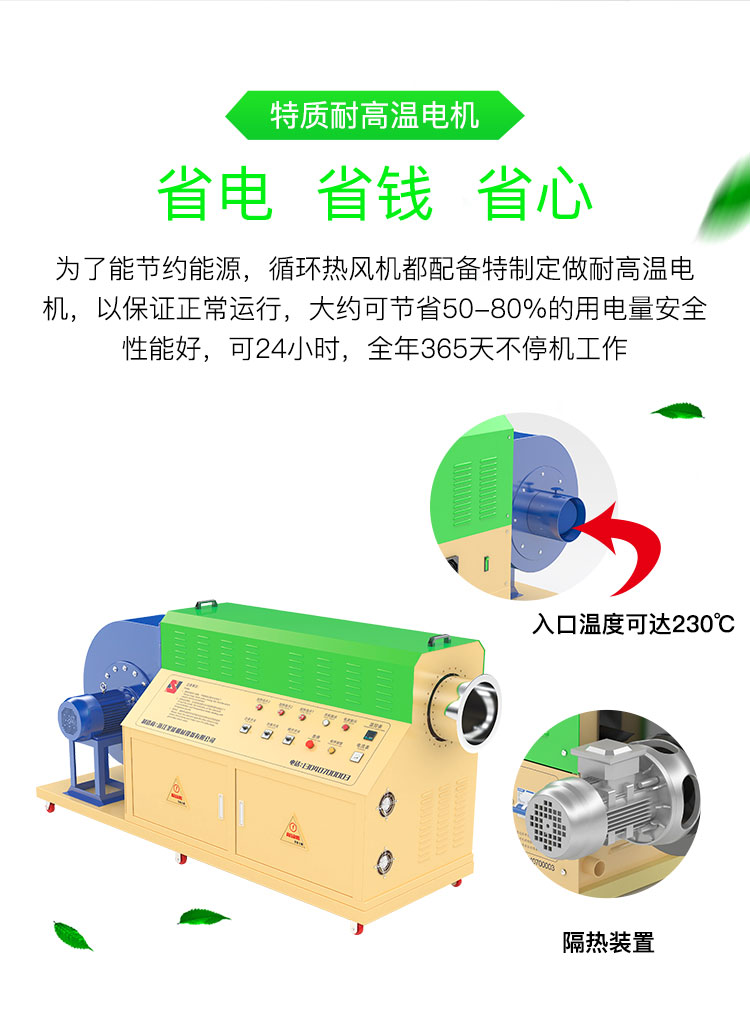 ④為了節(jié)約能源,循環(huán)型系列熱風(fēng)機都配備特制定做耐高溫電機,以保證正常運行,大約可節(jié)省50-80%的用電量。