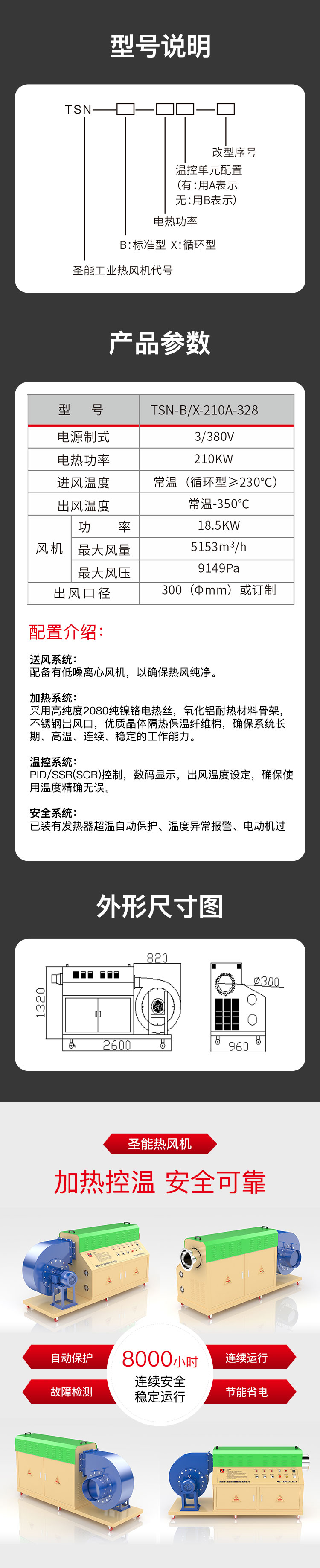 “TSN”工業(yè)熱風(fēng)機主要由送風(fēng)系統(tǒng)、加熱系統(tǒng)、溫控系統(tǒng)三大部分部分組成。通電后,鼓風(fēng)機把空氣吹送到加熱器里,令空氣從螺旋狀的電熱絲內(nèi)、外側(cè)均勻通過,電熱絲通電后產(chǎn)生的熱量與通過的冷空氣進行熱交換,從而使出風(fēng)口的風(fēng)溫升高。出風(fēng)口處的K型熱電偶及時將探測到的出風(fēng)溫度反饋到溫控儀,儀表根據(jù)設(shè)定的溫度檢測著工作的實際溫度,并將有關(guān)信息傳遞回固態(tài)繼電器進而控制加熱器是否工作。同時,鼓風(fēng)機可利用風(fēng)量調(diào)節(jié)器(變頻器、手動)調(diào)節(jié)吹送空氣的風(fēng)量大小。另外,送風(fēng)系統(tǒng)及加熱器,均有過載超溫自動保護裝置,總電路也設(shè)計了緊急摯,以保證安全,防止錯誤操作。