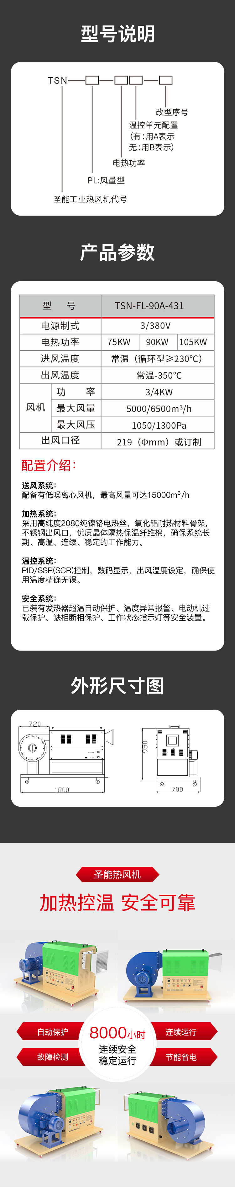 風量型熱風機主要由空氣加熱器和離心風機組成。空氣加熱器加熱產熱散熱,由離心風機將熱量輸出,從而調節空間溫度,風量型熱風機中加熱元件由2080鎳鉻絲加工成螺旋導管組成,從而發熱快、溫度效果好、工作風量大壓力較低。根據使用場所可分為:家用風量型熱風機和農業用風量型熱風機。從而家用和農業用風量型熱風機需根據客戶使用情況來進行風機和加熱功率的配比,望請客戶采購時將現場工況詳細說明。