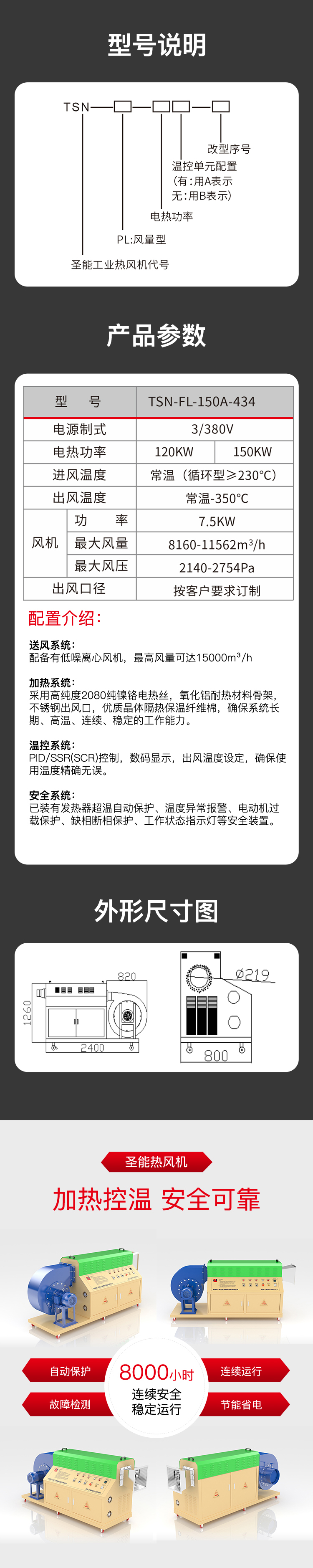 風(fēng)量型熱風(fēng)機(jī)主要由空氣加熱器和離心風(fēng)機(jī)組成。空氣加熱器加熱產(chǎn)熱散熱,由離心風(fēng)機(jī)將熱量輸出,從而調(diào)節(jié)空間溫度,風(fēng)量型熱風(fēng)機(jī)中加熱元件由2080鎳鉻絲加工成螺旋導(dǎo)管組成,從而發(fā)熱快、溫度效果好、工作風(fēng)量大壓力較低。根據(jù)使用場(chǎng)所可分為:家用風(fēng)量型熱風(fēng)機(jī)和農(nóng)業(yè)用風(fēng)量型熱風(fēng)機(jī)。從而家用和農(nóng)業(yè)用風(fēng)量型熱風(fēng)機(jī)需根據(jù)客戶使用情況來進(jìn)行風(fēng)機(jī)和加熱功率的配比,望請(qǐng)客戶采購(gòu)時(shí)將現(xiàn)場(chǎng)工況詳細(xì)說明。