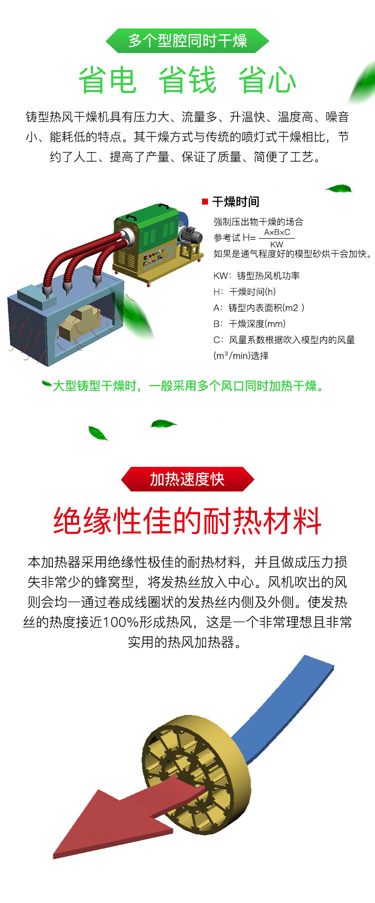 鑄型熱風(fēng)機(jī)在鑄造上主要用于型砂水分干燥及大、中、小型砂在配箱后內(nèi)腔的整體干燥。是鑄造企業(yè)優(yōu)化生產(chǎn)工業(yè)、提高效率、保證產(chǎn)品質(zhì)量的有效方法及關(guān)鍵設(shè)備。鑄型熱風(fēng)機(jī)的選型主要根據(jù)鑄件大小或者澆口數(shù)量。其主要用于鑄件澆鑄前配箱后型箱內(nèi)腔的整體均勻干燥。鑄型熱風(fēng)機(jī)與型箱之間的連接采用軟管連接方式。鑄件澆鑄前,首先將熱風(fēng)機(jī)的出風(fēng)口連接到型腔的澆口冒口處,連續(xù)不間斷鼓入高溫?zé)釟饬?,使熱氣流在型箱?nèi)形成正壓,保證熱氣流到達(dá)每處細(xì)小空隙,多腔結(jié)構(gòu)也能干燥充分。腔內(nèi)形成正壓后自動(dòng)從冒口排出,從而形成熱氣對(duì)流,能快速蒸發(fā)結(jié)構(gòu)水分,對(duì)澆鑄面無影響,提高了成品率和干燥速度,降低功耗,節(jié)約生產(chǎn)時(shí)間,提高生產(chǎn)效率。